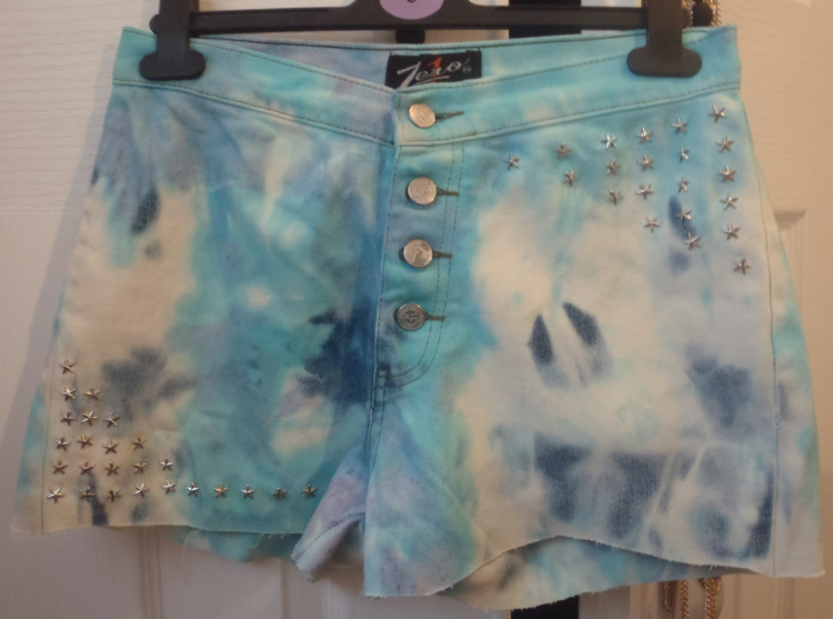 The other night while sorting out the loft I came across a big pile of my Mam's old jeans, She did'nt want them any more so I thought I'd have a go a a bit of DIY with them and turn them into shorts. I really like the Ragged Priest things so took a bit of inspiration from that. Since ordering the star studs of eBay for my denim jacket I have been obsessed with studding everything! Also tie dying everything, I will have nothing left in its original condition soon!